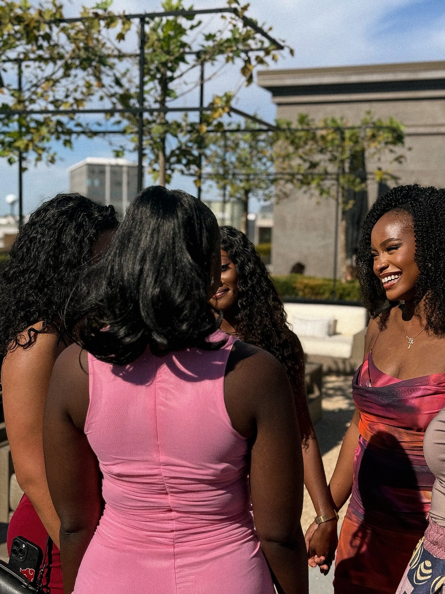 Group of women smiling and talking outdoors on a sunny day, dressed in colorful summer clothes.